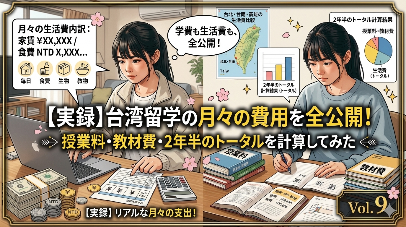 CATEGORY 費用・お金の話 【実録】台湾留学の月々の費用を全公開!授業料・教材費・2年半のトータルを計算してみた 2026.04.16 費用・お金の話 じゃいコ 花ちゃんの台湾留学ブログ |母のリアル体験記 【実録】台湾留学予備校との契約、最初にかかった費用を全公開 2026.04.16 費用・お金の話 じゃいコ 花ちゃんの台湾留学ブログ |母のリアル体験記